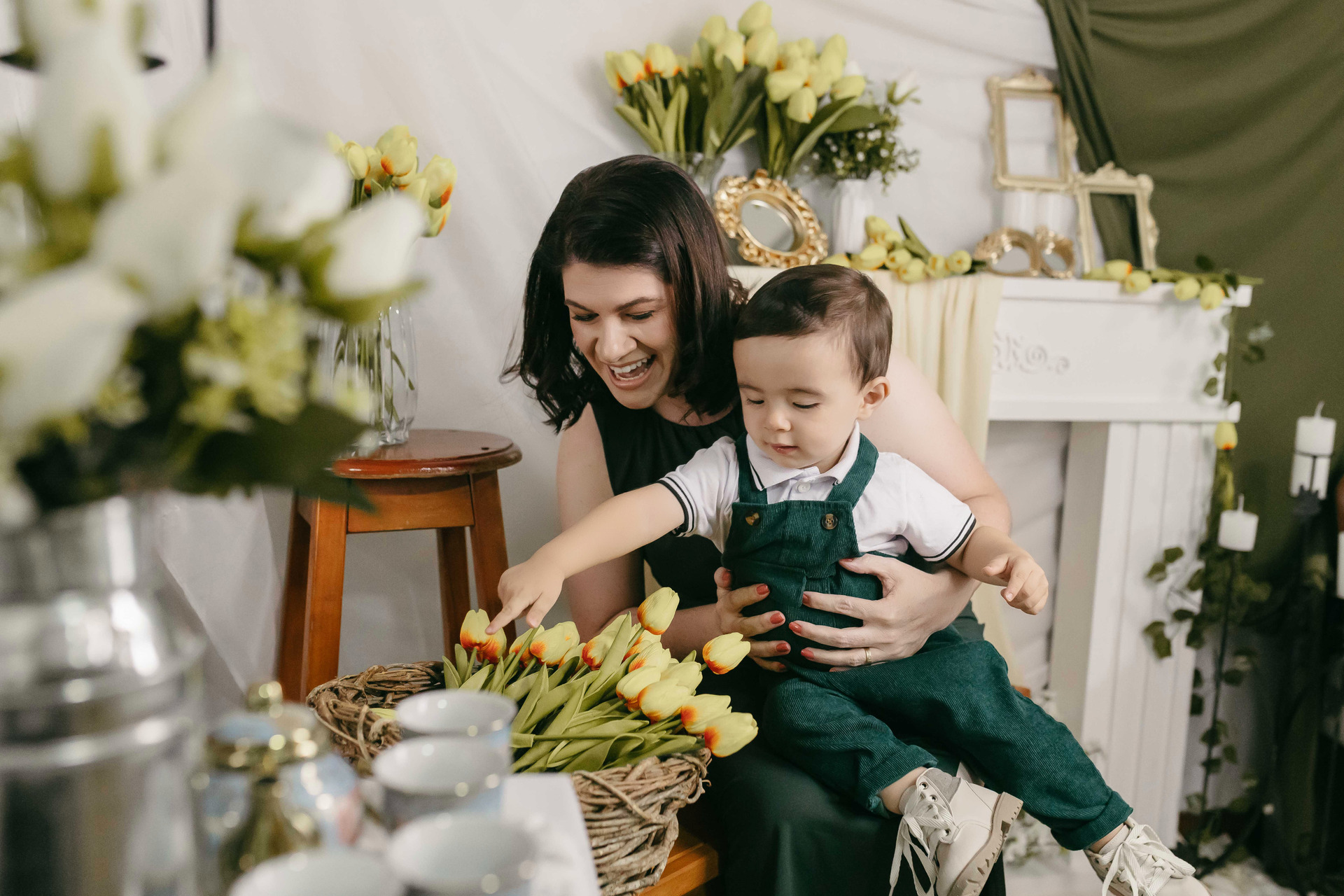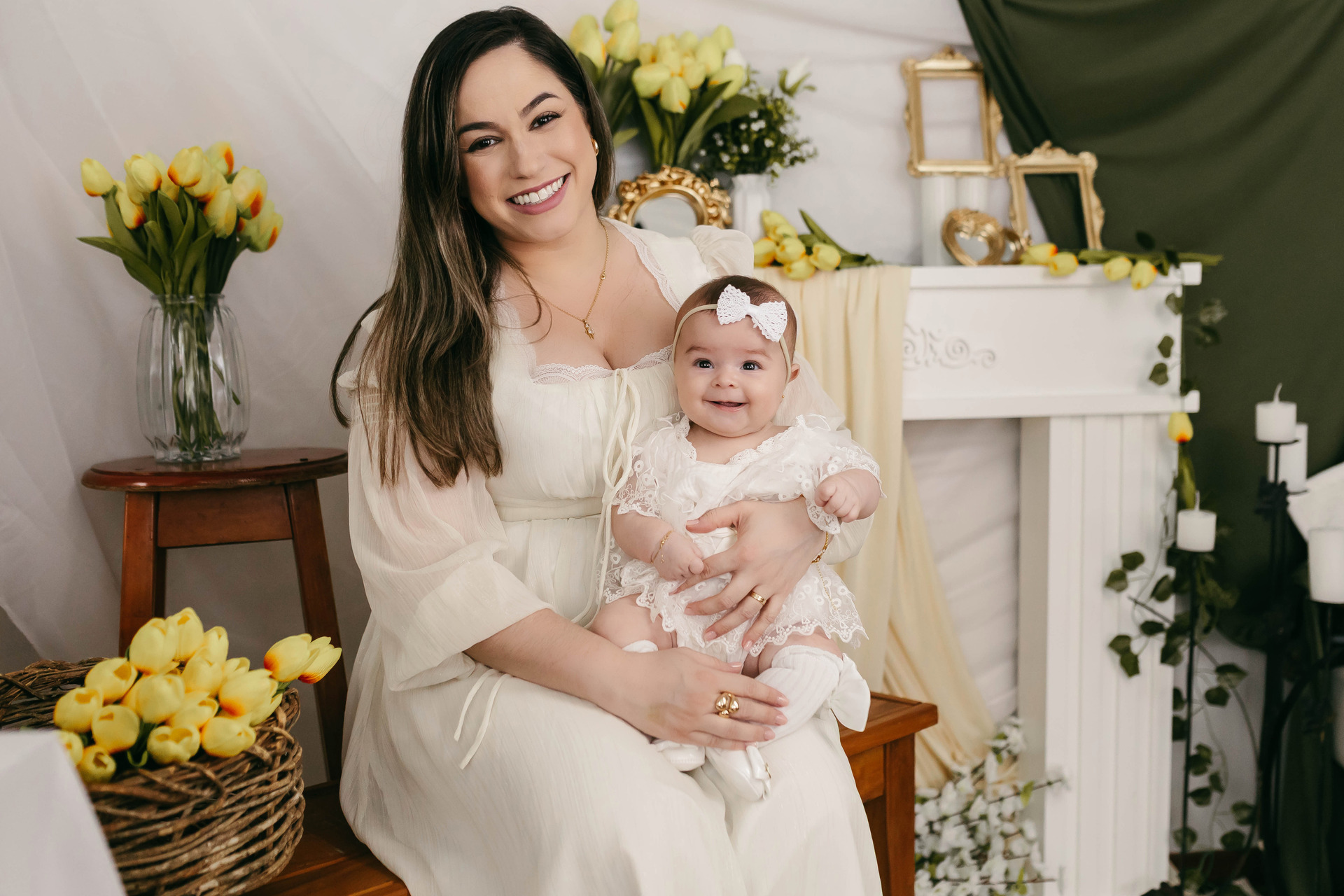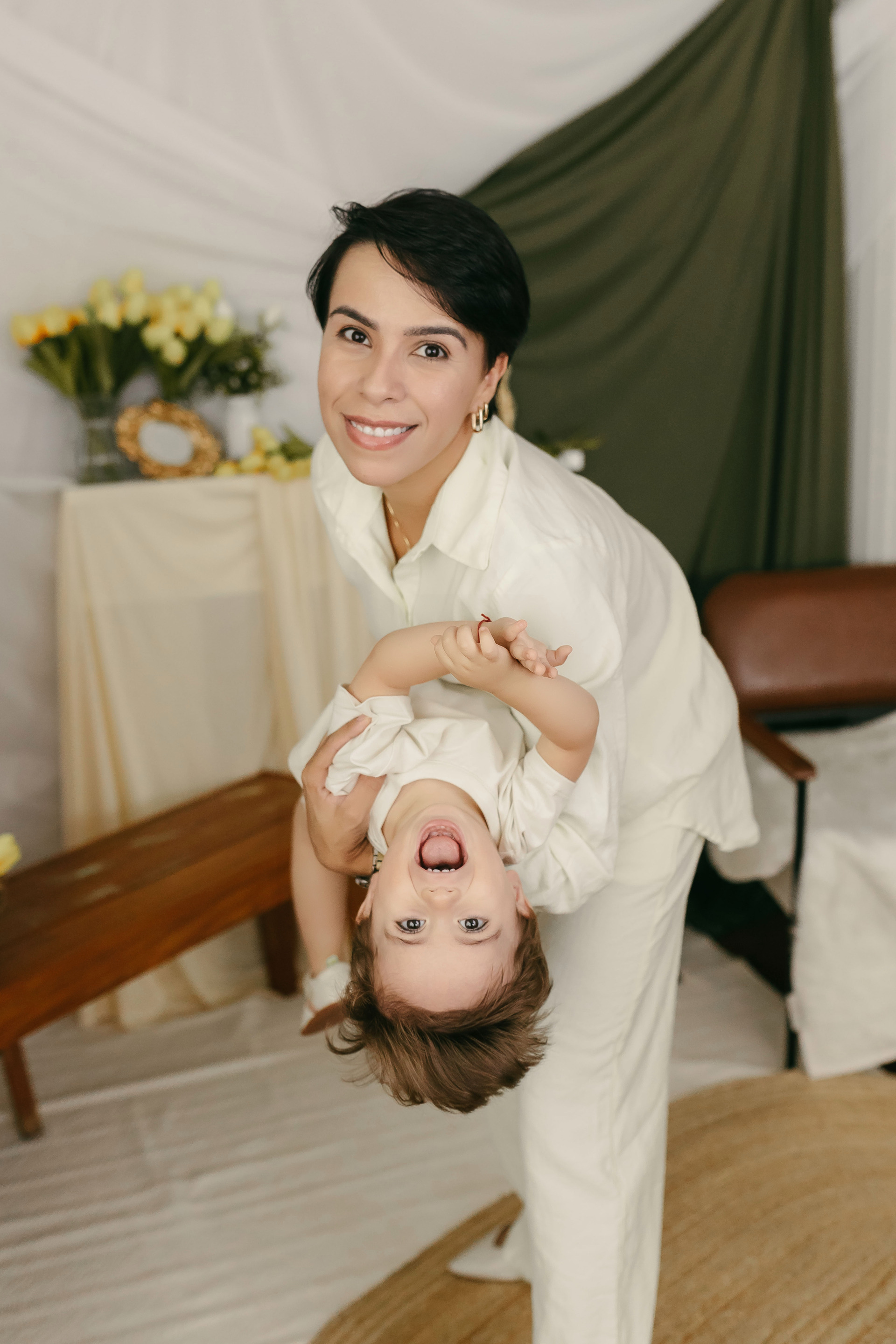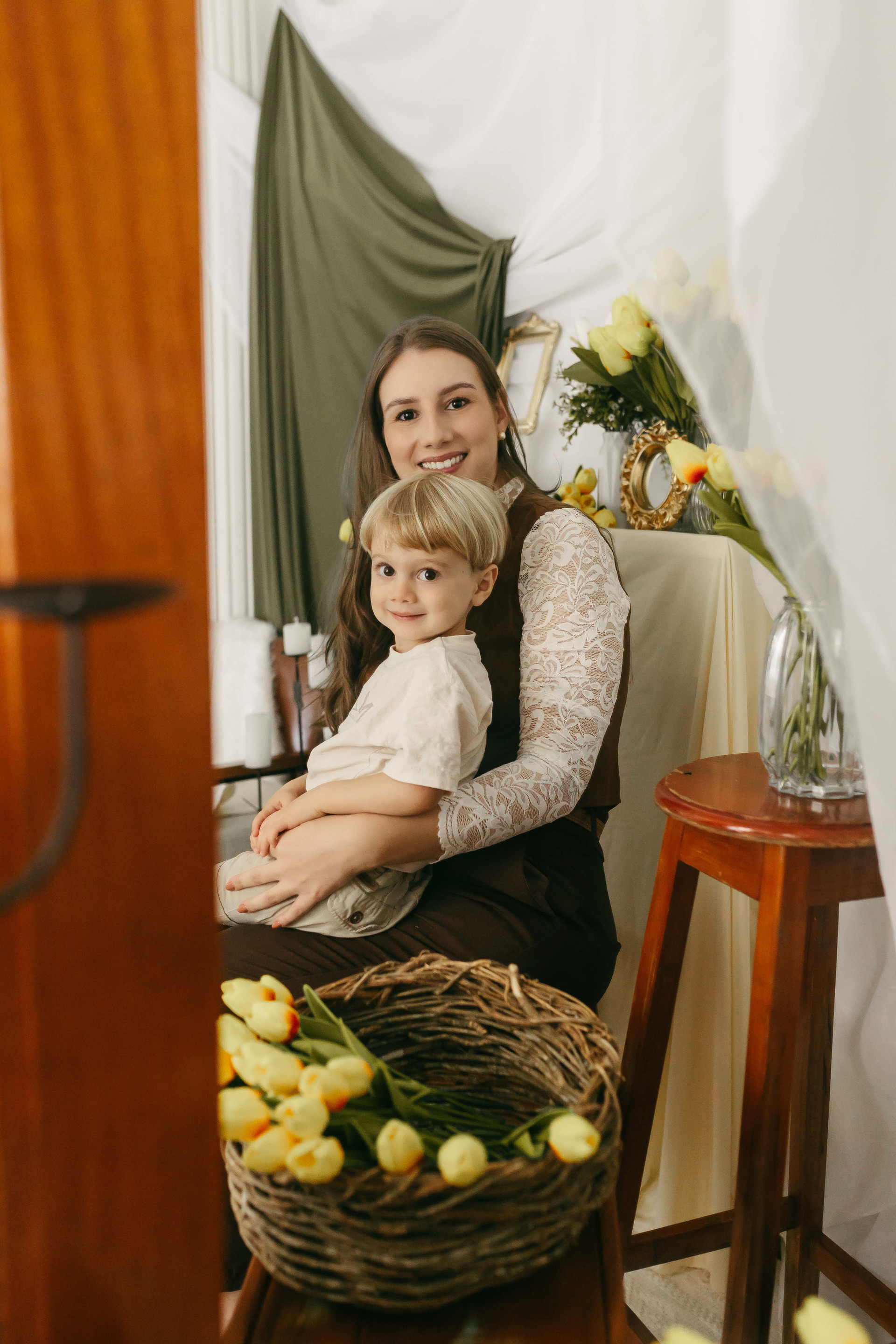 O fundo em tecidos claros e cortinas em tons quentes cria profundidade e suavidade, enquanto a decoração minimalista mantém o foco no que realmente importa: o vínculo, o carinho e o momento vivido.
